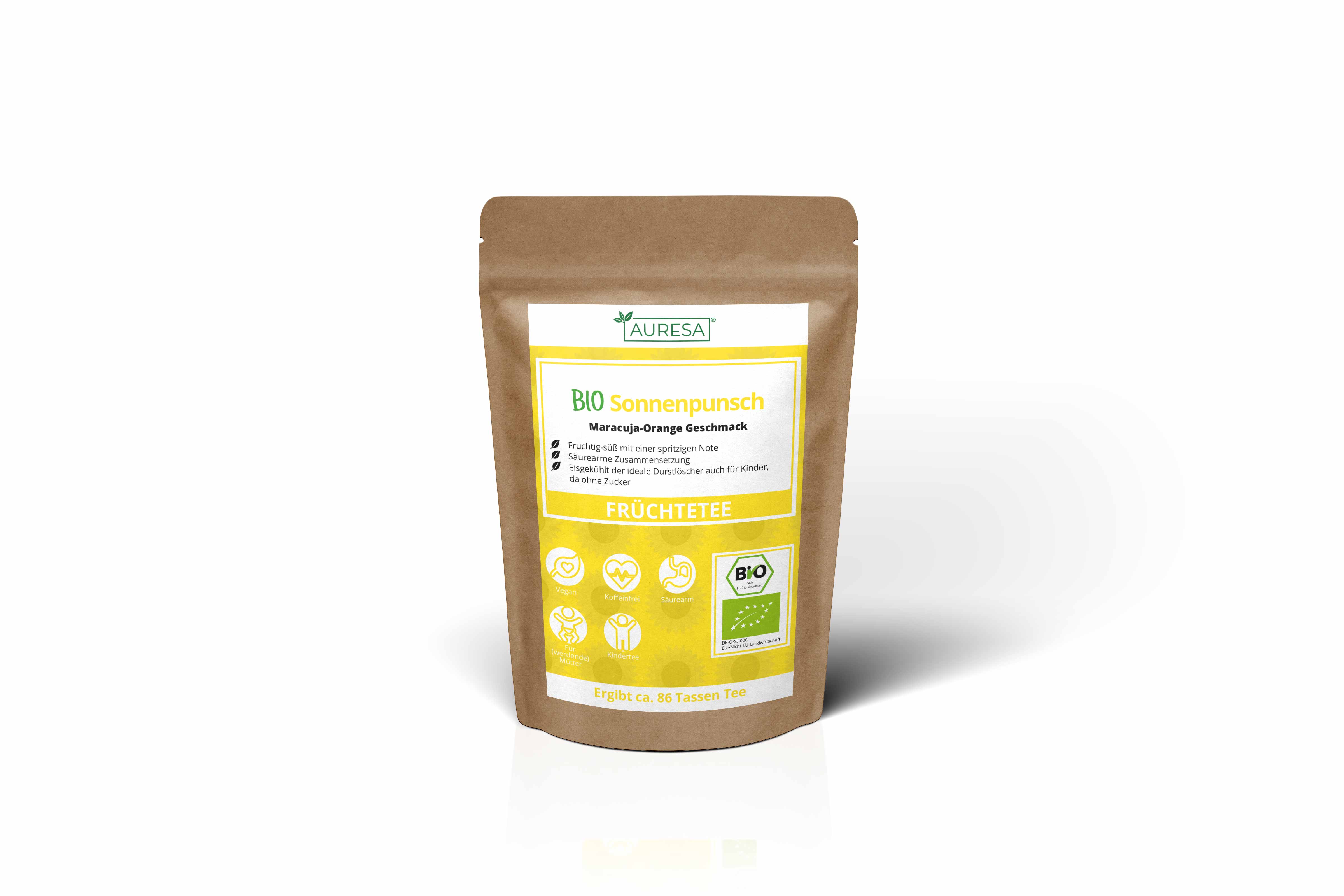 The loose tea is packaged in three different versions with different amounts of content, which can be viewed under "Amount". 1. Doypack (stand-up pouch) The stand-up pouches have a tear notch on both sides so that the weld that protects the tea can be easily torn. In addition, all doypacks are equipped with a resealable pressure lock. The stand-up pouches are food-safe, stable and odorless and tasteless. 2. glass High-quality storage jars with cork closures for protected storage and refilling. The tea glasses are hygienic, easy to care for and dishwasher safe and have a diameter of 70 mm (Ø 39 mm filling area) and 130 mm height. 3. Tubular bag The sales quantity 1000g is sent in a non-resealable tubular bag.