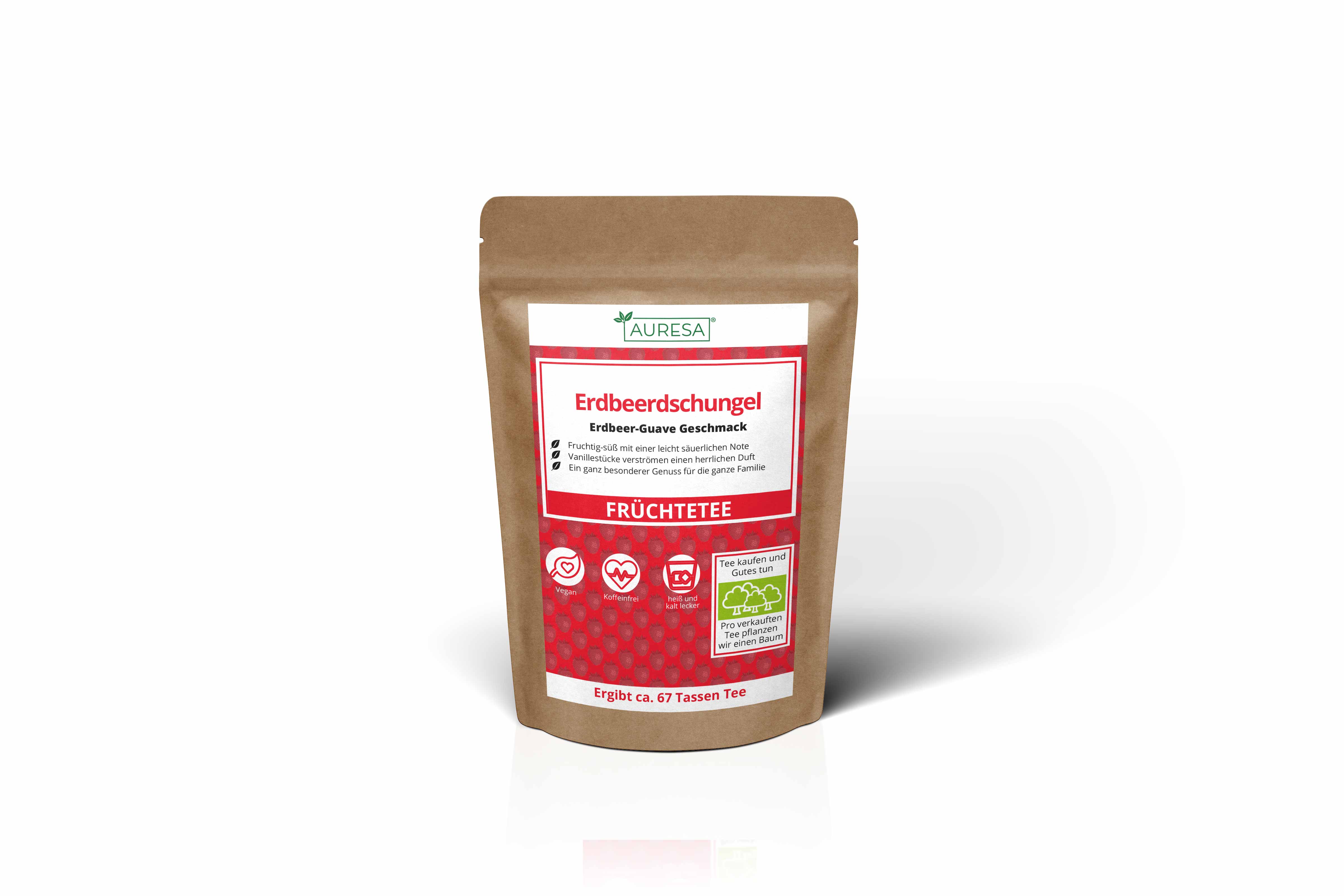 The loose tea is packaged in three different versions with different amounts of content, which can be viewed under "Amount". 1. Doypack (stand-up pouch) The stand-up pouches have a tear notch on both sides so that the weld that protects the tea can be easily torn. In addition, all doypacks are equipped with a resealable pressure lock. The stand-up pouches are food-safe, stable and odorless and tasteless. 2. glass High-quality storage jars with cork closures for protected storage and refilling. The tea glasses are hygienic, easy to care for and dishwasher safe and have a diameter of 70 mm (Ø 39 mm filling area) and 130 mm height. 3. Tubular bag The sales quantity 1000g is sent in a non-resealable tubular bag.